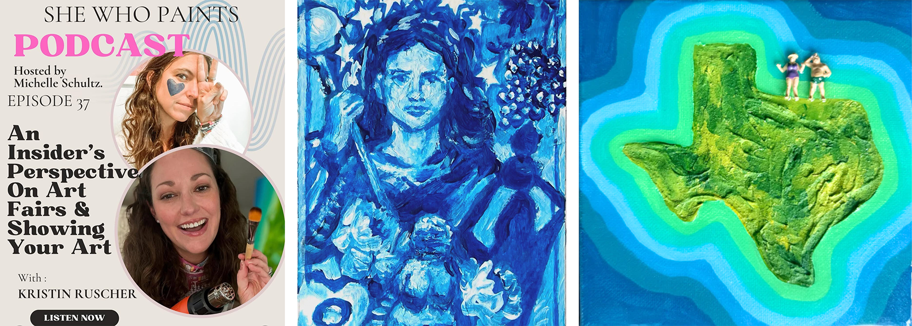 Michelle’s podcast featuring Kristin Ruscher, “The Empress” by Michelle center, and “The Island of Texas” by Kristin on the right.